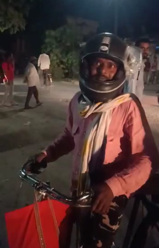 प्रदेशभर में हेलमेट को लेकर चलाए जा रहे अभियान का असर इस कदर देखने को मिलने लगा है कि कहीं ठेला चलाने वाला तो कही सायकल में भी चलने वाले हेलमेट लगाए नजर आने लगे है। हाल ही में सीधी जिले में सब्जी का ठेला चला रहा शख्स पुलिस की चालानी कार्यवाही के डर से हेलमेट लगाए नजर आया था जिसके बाद अब रीवा में एक सायकल सवार शख्स हेलमेट लगाकर सायकल चलाते देखा गया है।